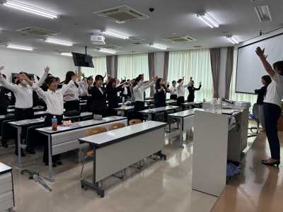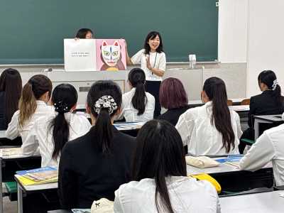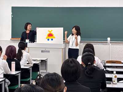 小西さんからは、伊勢市の子育て支援の取り組みや現状を、写真を交えて分かりやすく紹介していただきました。渡邉さんからは、保育者が行う絵本の読み聞かせや手遊び、パネルシアター、体操などを実演していただき、学生たちも笑顔で参加していました。