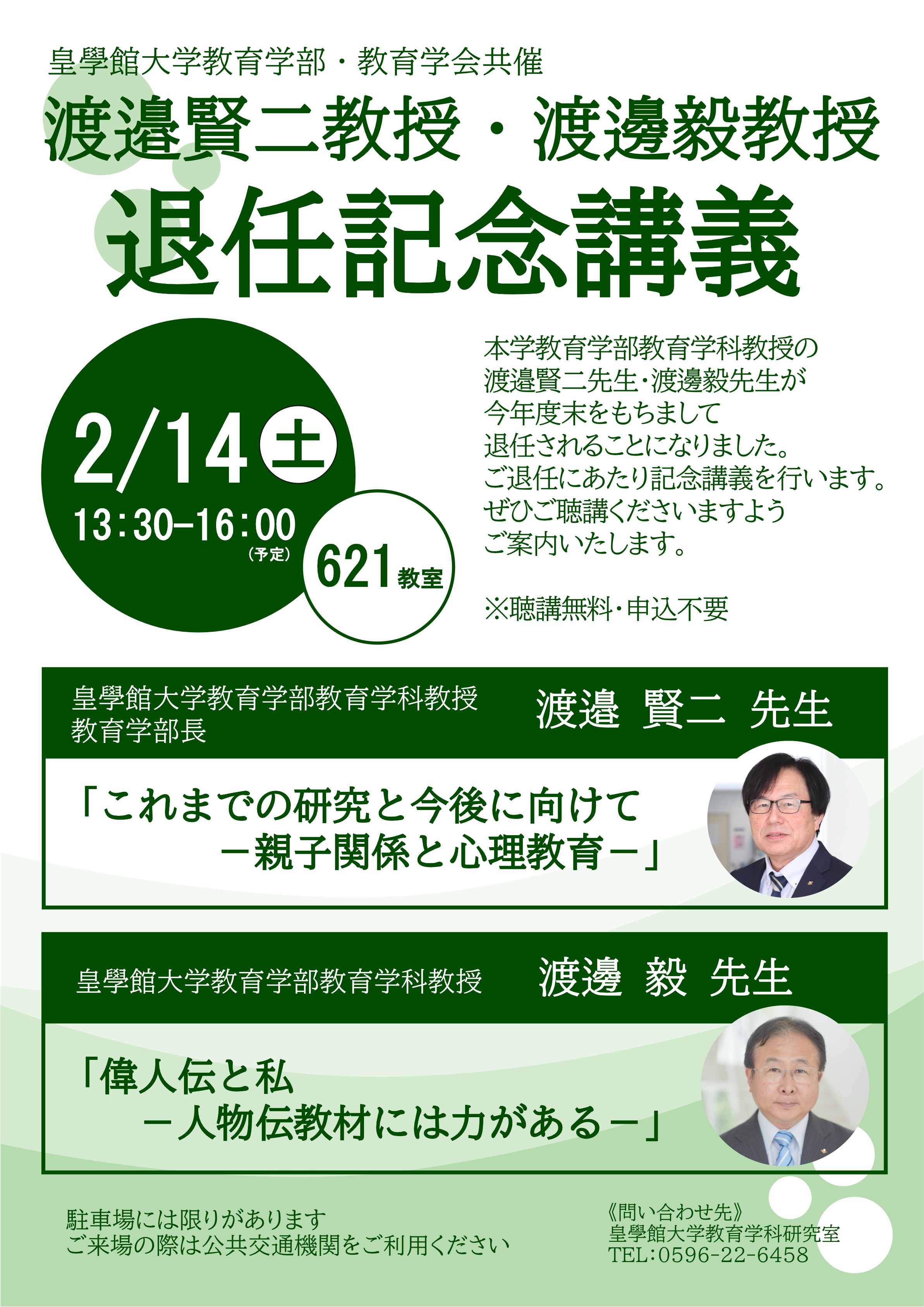 渡邉賢二先生、渡邊毅先生 ご退任記念講義 日時:2026年2月14日(土) 13:30 ~ 16:00 会場:621教室 渡邉賢二先生 演題:これまでの研究と今後に向けてー親子関係と心理教育ー 渡邊毅先生 演題:偉人伝と私ー人物伝教材には力があるー チラシはこちら