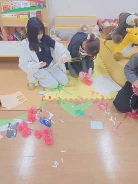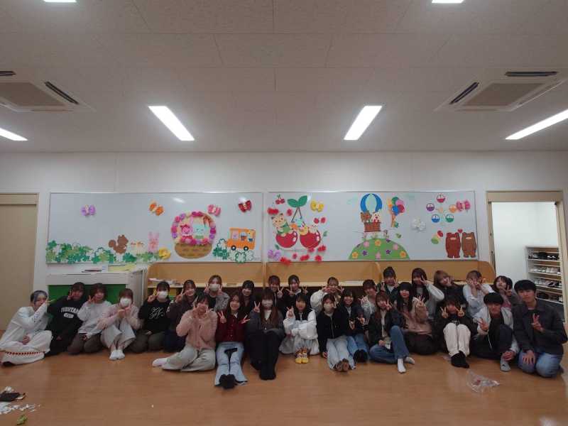 今回の授業では、地域子育て支援活動「ぴよぴよ」の開始を目前に控え、保育実習室の壁面製作を行いました。乳幼児の成長にとって、周囲の環境は極めて重要な役割を果たします。学生たちは「どのような環境が子どもたちの興味を高め、安心感を与えるか」を真剣に考え、構成から製作までを実践しました。ご参加いただくお子さまや保護者の皆様に、笑顔で楽しんでいただけるような温かい実習室が完成しました。